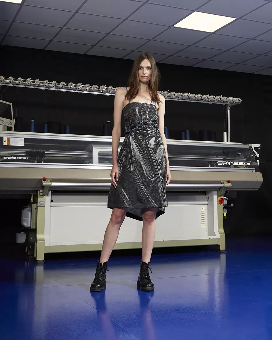 Il vestito utilizza 5 filati differenti, per la creazione della maglia, delle asole blu caratterizzanti il capo, e l'elastico EXTÉ 2.7 SOFT per donare al capo la morbidezza e compattezza necessarie a durare nel tempo.