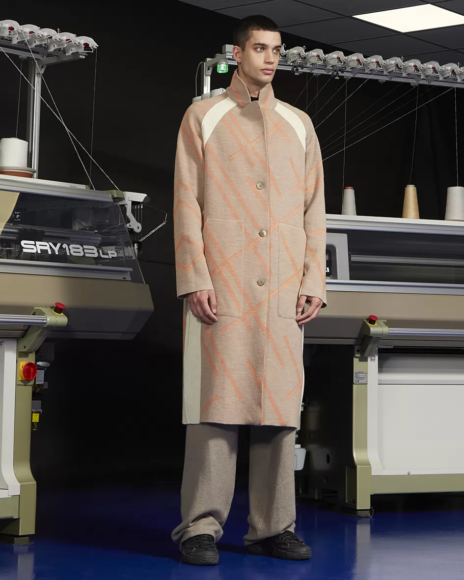 Cappotto a 6 fili per Jacquard, intarsio e finta costa, utilizza lana, Cashmere, Lino e filati tecnici, quali l'elastico MIC EXTÉ 2.7 SOFT per l'accoppiamento dei 2 tessuti in maglia che compongono esterno ed interno del capo.