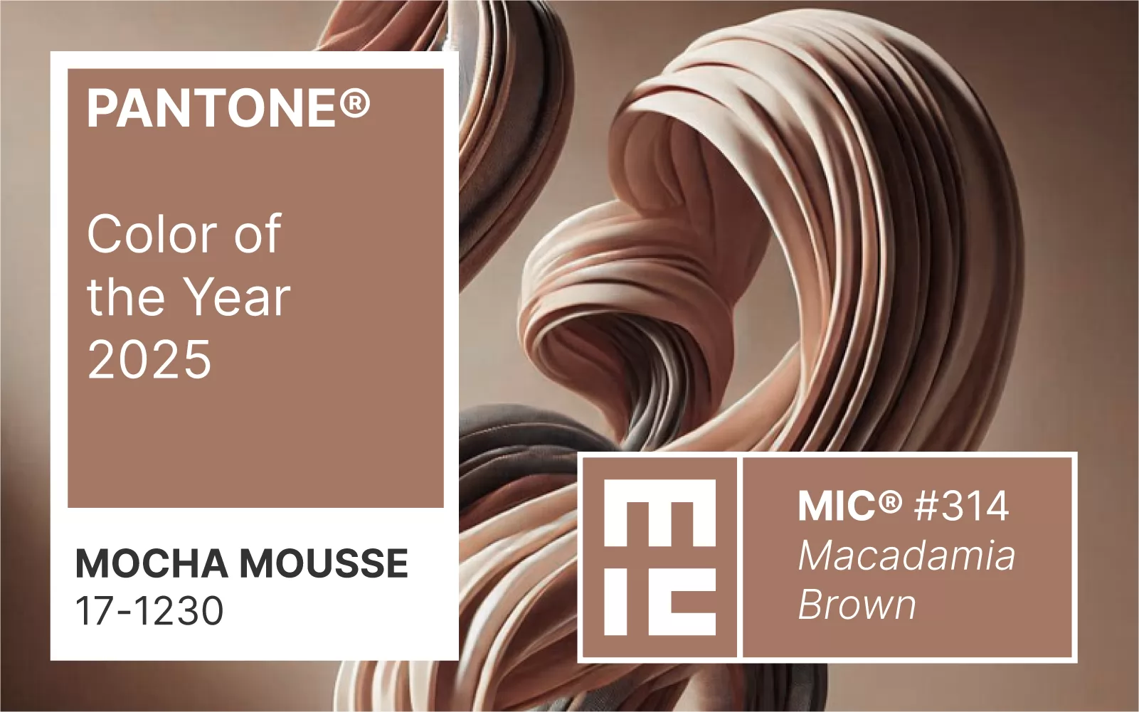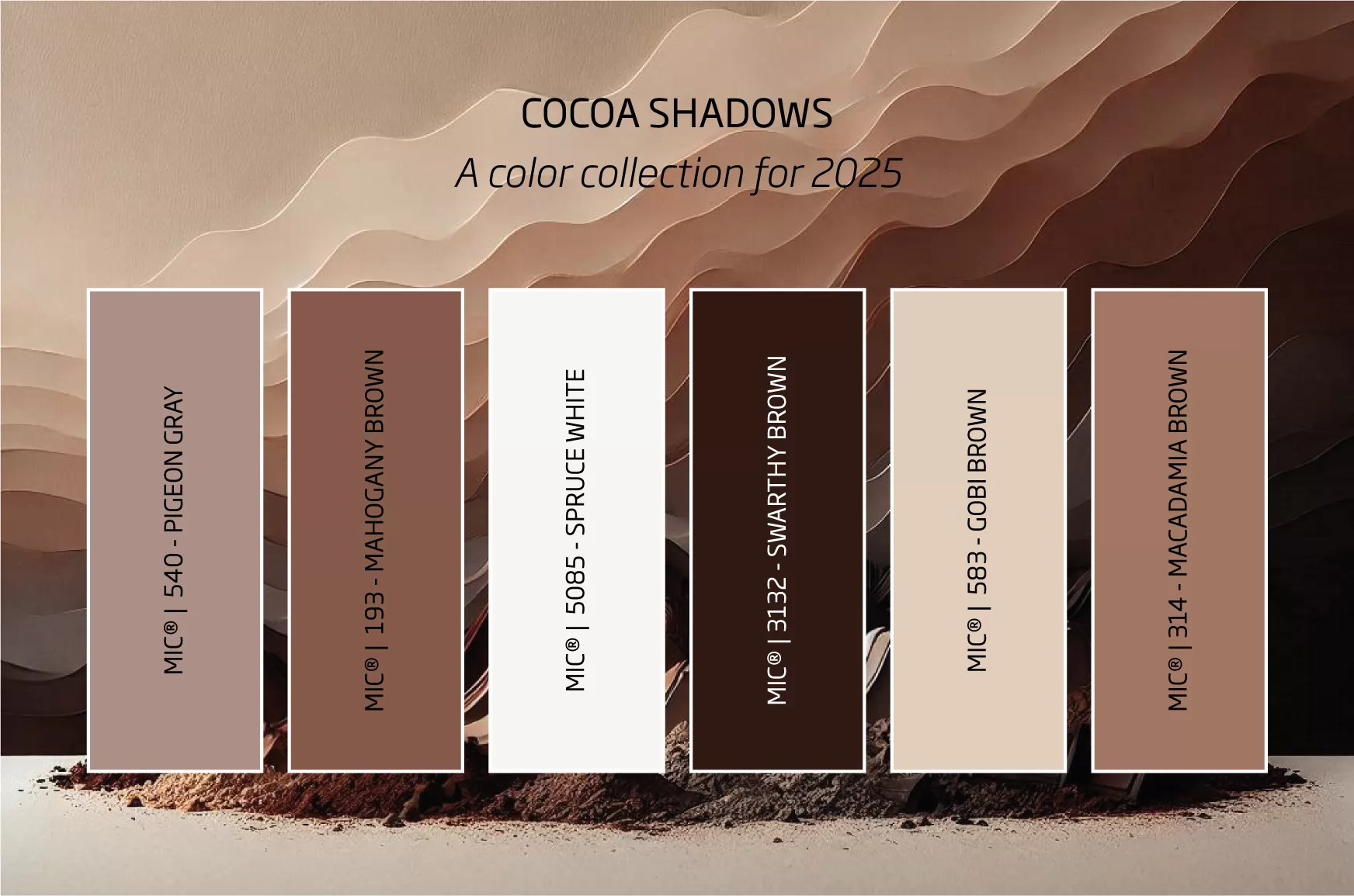 MIC ha scelto di ispirarsi a questa tonalità, proponendo il colore 314 Marrone Macadamia - Listello 12, Posizione 21 della cartella colori generale MIC - una nuance che incarna eleganza e naturalezza, e senzazioni che possiamo esprimere con un mood ispirato alle Ombre di Cacao.